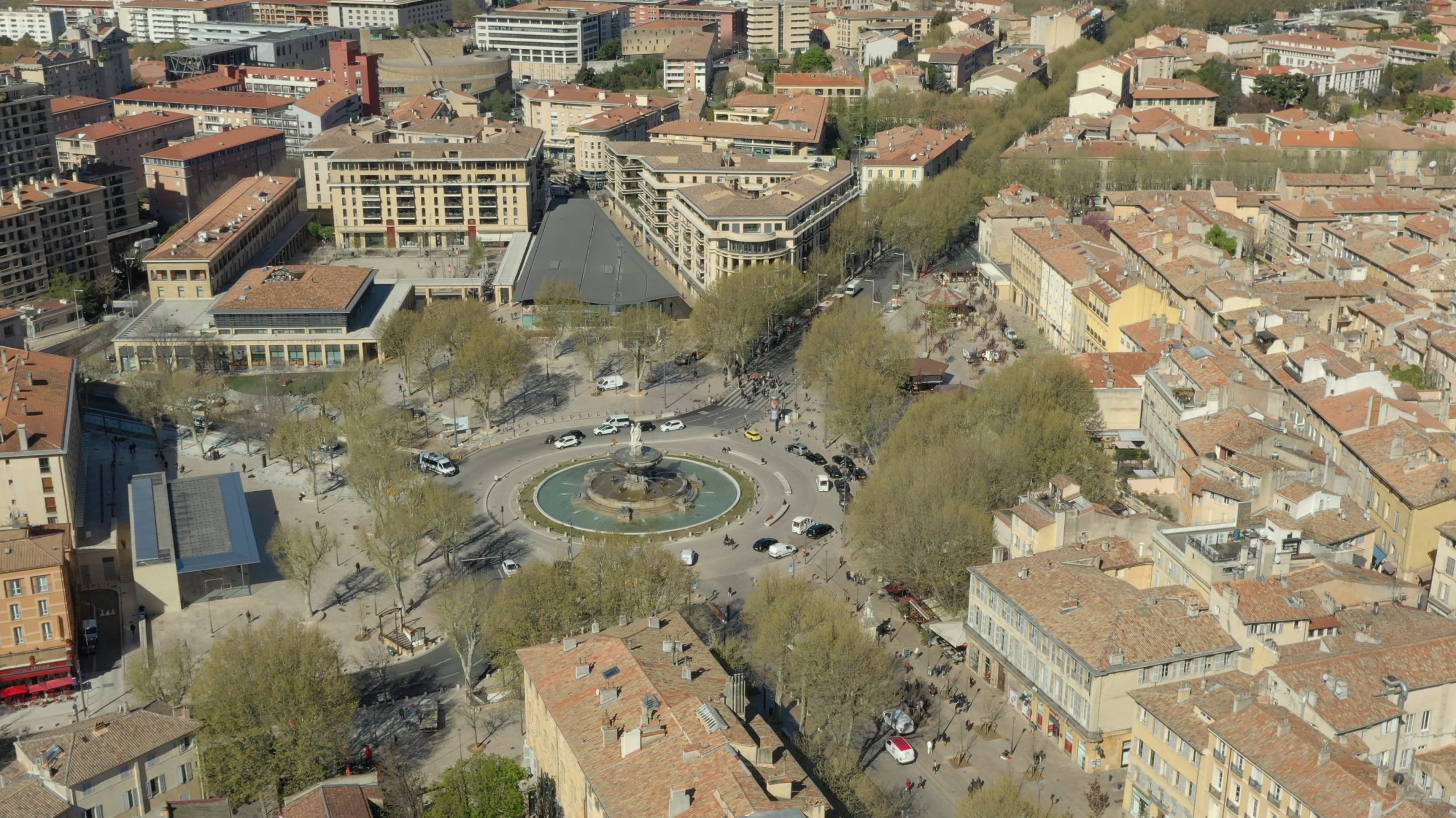 Vue aérienne du centre-ville d’Aix-en-Provence avec fontaine Rotonde, Provence, France