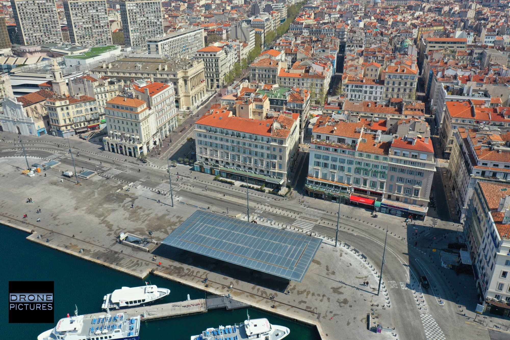 Vue aérienne du Vieux-Port à Marseille, pendant le confinement de 2020, Provence, France.